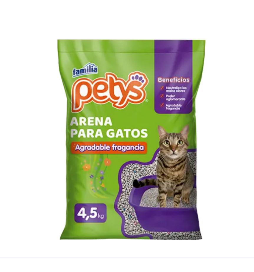 Arena para gatos Petys, controla los malos olores, tiene poder aglomerante y deja una agradable fragancia