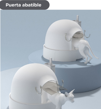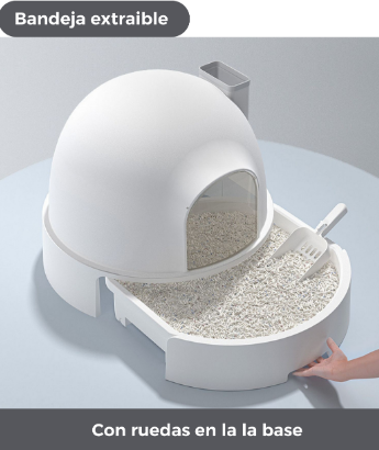 La Arenera Snow House tiene puerta abatible, una bandeja extraíble y con ruedas en la base que facilita la limpieza, además de contar un espacio apara la pala.