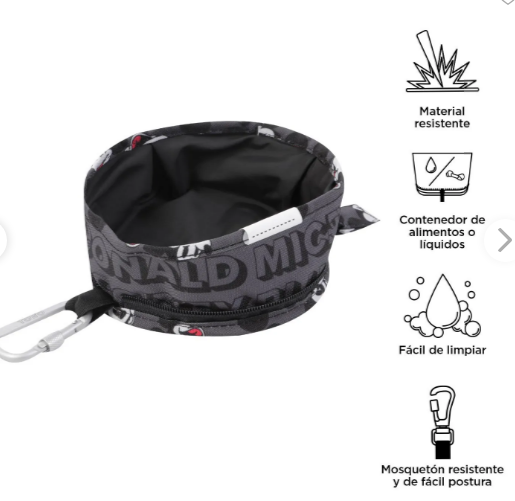¡El mejor complemento para los paseos con tu michi o peludito! El Bebedero Portátil Vito Mickey Mouse para mascota es muy práctico, resistente, fácil de limpiar y tiene un estampado de Mickey Mouse que te encantará. Está elaborado en poliéster y permite contener el líquido por un tiempo prolongado o servir alimento seco y húmedo. Puedes llevarlo fácilmente gracias a su sistema plegable con cremallera y mosquetón que trae la correa. ¡Encuéntralo en diferentes colores!Plegable Hazlo más pequeñoMaterial resistente a la fricciónFácil de limpiarCierre en cremalleraMosquetón de seguridad
