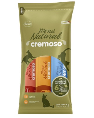 Chunky Menu Natural Cremoso Para Gatos es un snack húmedo y delicioso que tu gato amará y su paladar disfrutará. Este irresistible snack viene en tres sabores: Salmón, Pescado Blanco y Pavo, es un suplemento alimenticio para ser suministrado como snack a partir de los 6 meses con el que aportarás hidratación. Puedes suministrarlo directamente desde el empaque, servir en un plato o como topping en el concentrado.