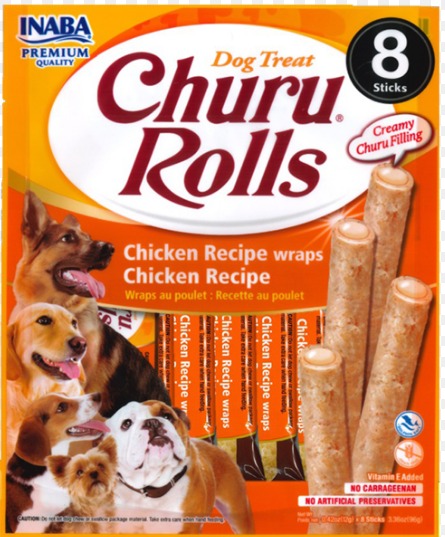 Churu Bites Chicken Recipe Wraps, es un snacks para perros que está hecho con deliciosos ingredientes de alta calidad, incluyendo pollo de granja y/o atún natural capturado en la naturaleza.Churu está hecho con una suave pasta de pollo al horno sin granos, conservantes, carragenanos ni colorantes artificiales. Cada unidad contiene un 72% de humedad para la hidratación y unas 16 kcal, lo que las convierte en un snack bajo en calorías que ayudará a una excelente nutrición. También contiene vitamina E para reforzar el sistema inmunitario y extracto de té verde como antioxidante.