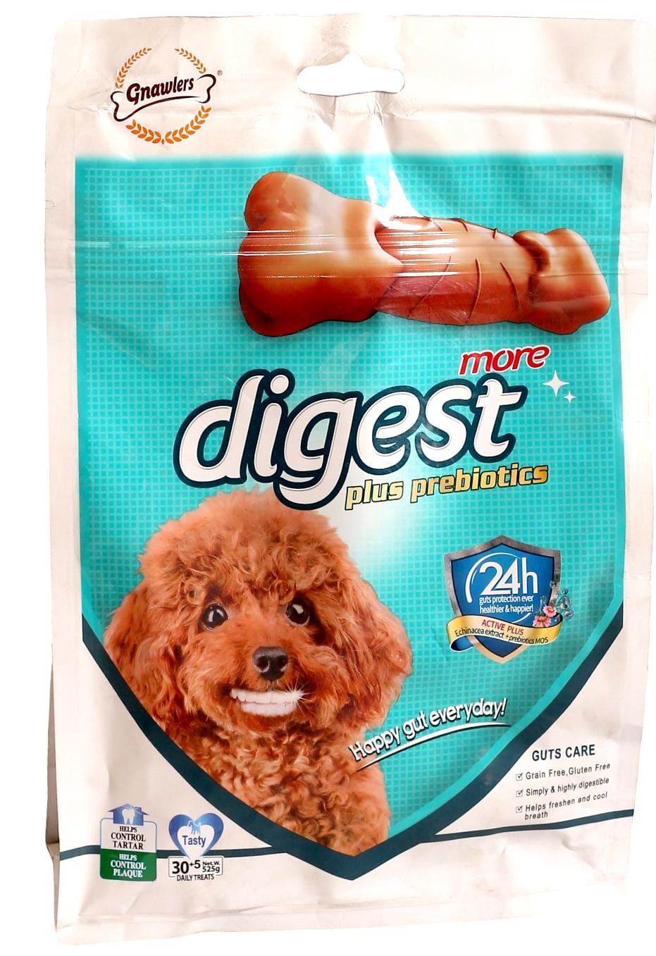 Digest More es una golosina dental sabrosa y de primera calidad que proporciona una salud bucal superior y la bondad total de los ingredientes naturalesNuestras golosinas masticables comestibles saludables brindan beneficios funcionales que su perro puede disfrutar en todas las etapas de la vida y no puede resistirse al delicioso saborNo apto para cachorros menores de 4 mesesGnawlers Digest More Plus Prebiotics es una línea sabrosa y premium de golosinas dentales que proporciona una salud bucal superior y la bondad total de los ingredientes naturales.Lo mejor en calidad