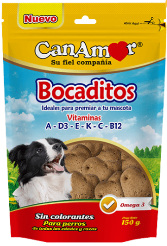Las Galletas Bocaditos de Can Amor son un suplemento alimenticio completo para suministrar a perros de todas las razas. Enriquecidas con Vitamina A, Vitamina D3, Vitamina E, Vitamina K, Vitamina C, Vitamina B12, Zinc, Selenio y Omega 3 que complementan la dieta y mejora el funcionamiento del corazón, músculos, piel y pelo. Ademas le aporta beneficios a tu mascota que la mantiene saludable y vital. Es ideal para premiar a la mascota o en entrenamiento. El aporte de vitaminas que incluyen estas galletas en su composición fortalece el vínculo con el propietario. manteniendo así el brillo y sedosidad del pelo.MODO DE ADMINISTRACIÓN:Suministre el premio o snack Bocaditos CanAmor como un complemento a la dieta diaria de su mascota, sin exceder el consumo diario.PESO DEL PERRO:Menos de 10 kilos 4 al día o 20 gramos.10 a 30 kilos 8 al día o 40 gramos.Mas de 30 kilos 10 al día o 50 gramos.RECOMENDACIONES:Suministrar agua limpia y fresca todos los días. Conservar el producto en su empaque cerrado. Este producto no sustituye el alimento completo. Conservar este producto protegido de la luz solar directa en un lugar fresco y seco. No almacenar con productos tóxicos. Prohibido su uso en animales rumiantes. Consultar regularmente a su médico veterinario.