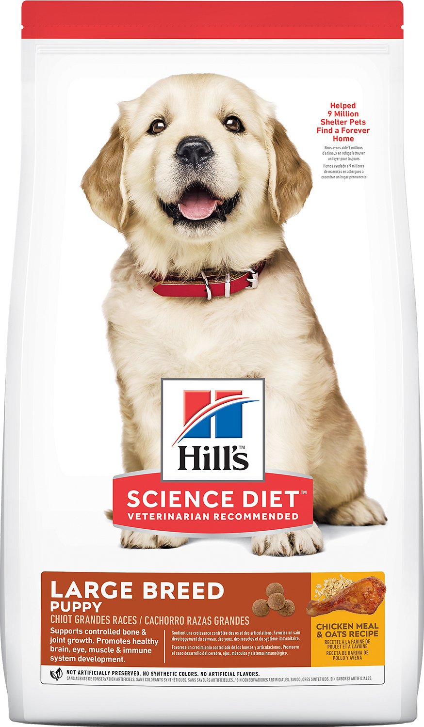 El alimento seco Hill’s® Science Diet® Large Breed Puppy está hecho especialmente con un nivel óptimo de calcio para el crecimiento controlado de huesos, una necesidad única en el desarrollo de cachorros de razas grandes. Deles el mejor comienzo en la vida para que puedan crecer a su máximo potencial.Minerales balanceados para huesos y dientes fuertesDHA de aceite de pescado para el sano desarrollo del cerebro y los ojosProteína de alta calidad para desarrollar músculos magrosSe recomienda para:Cachorros de razas grandes (más de 55 lbs cuando adultos) hasta 1 año de edad.