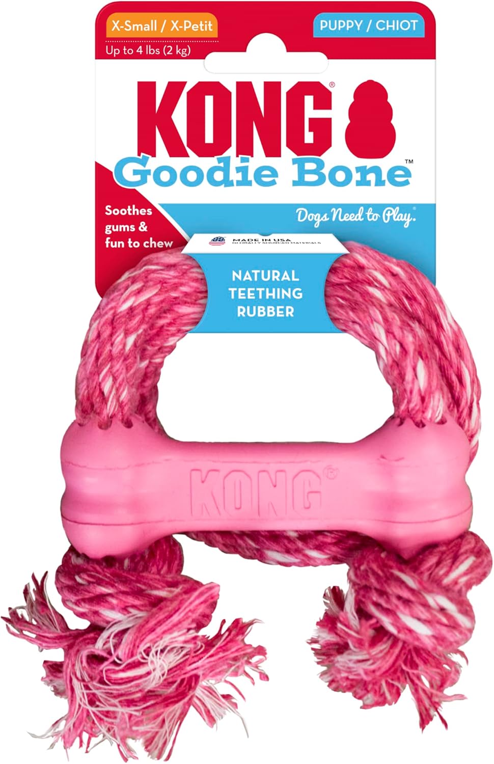 The KONG Goodie Bone™ with Rope es el regalo perfecto para aquellos perros a los que les gusta masticar juguetes y, con su soga de algodón completamente natural, es ideal para satisfacer sus necesidades instintivas. Fabricado con la fórmula exclusiva de caucho rojo completamente natural KONG Classic, este hueso también posee una soga completamente de algodón que le ofrece a su perro diferentes opciones a la hora de masticar. Fabricados con orgullo en EE. UU.Dimensiones del producto: X-Small:17.2 x 8.8 x 2 cm