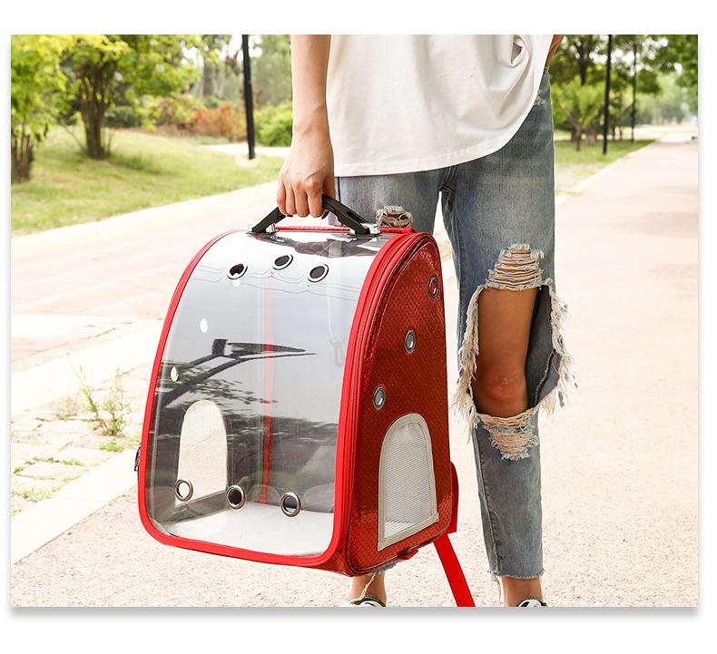Morral tipo mochila para transportar mascotas pequeñas con diseño moderno y transparente. Incluye ventilación en malla a los lados, cremallera doble y acabado color rojo con estilo sirena. Ideal para perros o gatos pequeños, ofreciendo visibilidad, comodidad y seguridad durante el traslado.