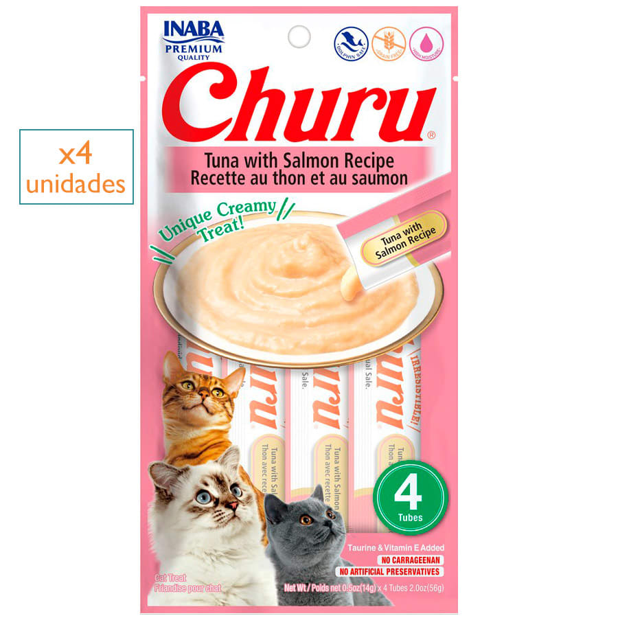 Este sabroso snack para gatos sabor atún y salmón, se hacen con atún silvestre de verdad. Los Churu® tienen el alto contenido de humedad necesario para la salud de los felinos. Simplemente rasga un tubo y apriétalo un poco para alimentar a mano a su felino. También puede verterlo en un plato o añadirlo por encima de alimentos húmedos o secos