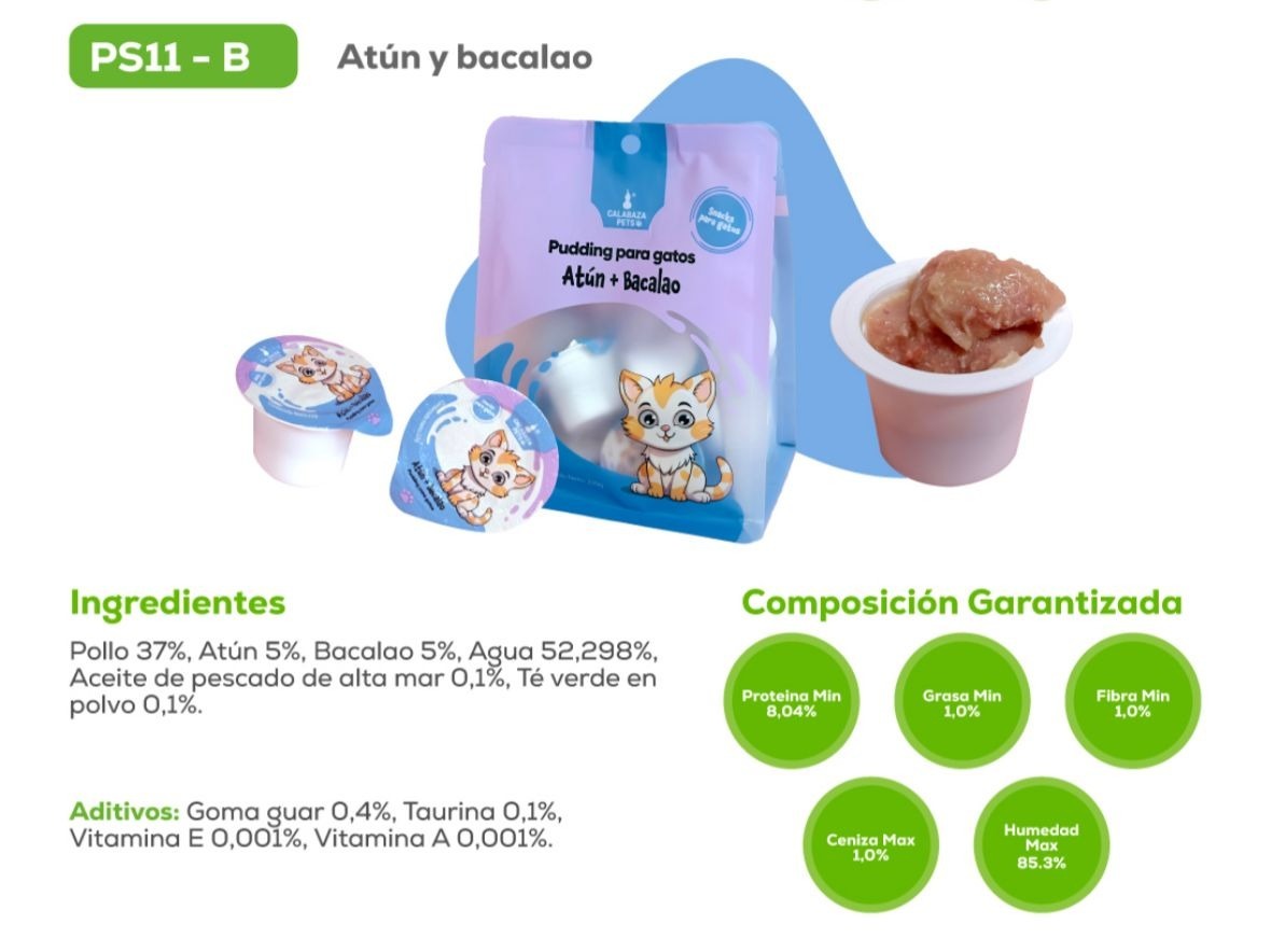 Un snack cremoso, sabroso y lleno de beneficios para tu gato. Este pudín de textura suave combina el exquisito sabor del atún y el bacalao, dos fuentes de proteína magra y omega-3 que ayudan a mantener un pelaje brillante y una buena salud general. Ideal como premio, complemento alimenticio o incluso para mezclar con el alimento seco y mejorar su palatabilidad. Su formato en porciones individuales lo hace práctico, higiénico y perfecto para consentir a tu gato cada día.