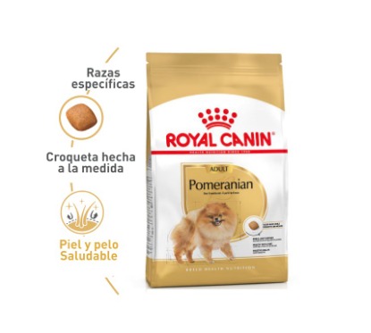 ROYAL CANIN® Pomerania Adulto es una fórmula exclusiva para razas hecha a la medida especialmente para los perros Pomerania adultos como los suyos. ROYAL CANIN® Pomerania Adulto contiene nutrientes avanzados y un contenido de minerales adaptado para ayudar a apoyar articulaciones y huesos sanos. Esta fórmula ayuda a apoyar la función de barrera protectora natural de la piel de su perro, nutriendo a la vez el pelaje glorioso de los Pomerania. Esta fórmula utiliza proteínas de alta calidad altamente digestibles para ayudar a apoyar la digestión eficiente. Su mezcla balanceada de fibras ayuda a facilitar el tránsito interno saludable y a estimular la calidad óptima de las heces. ROYAL CANIN® Pomerania Adulto ofrece una croqueta hecha a la medida, con una forma, tamaño, textura y densidad acondicionados para adaptarse al tamaño y a la forma de la mandíbula de los Pomerania. Para atraer el apetito de cada perro, ROYAL CANIN® Pomerania Adulto se encuentra disponible también como alimento húmedo con una textura tipo lonja y con la misma nutrición de apoyo. Si a su perro le encanta la dieta de alimento tanto húmedo como seco, asegúrese de revisar las guías de alimentación que vienen en el empaque para tener la certeza de darles la cantidad exacta de cada uno.