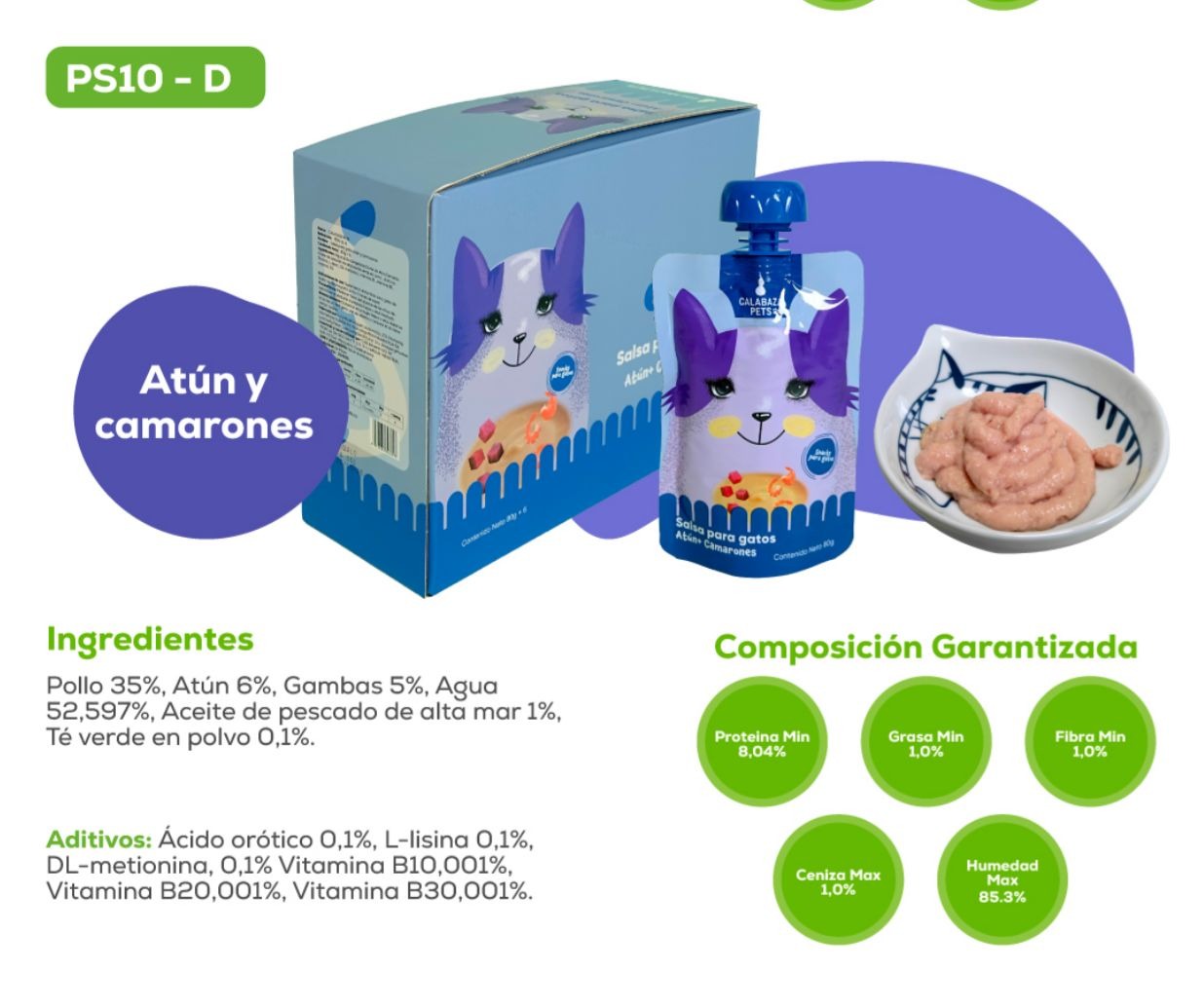 Una explosión de sabor marino para consentir a tu felino. Esta deliciosa salsa elaborada con atún y camarones reales es el complemento perfecto para mejorar el sabor del alimento seco o húmedo, estimular el apetito y ofrecer un toque gourmet en cada comida. Enriquecida con proteínas de alta calidad y omega-3, esta fórmula ayuda a mantener un pelaje brillante, una piel sana y una buena digestión. Su textura suave y aroma irresistible la convierten en la favorita de los gatos más exigentes.