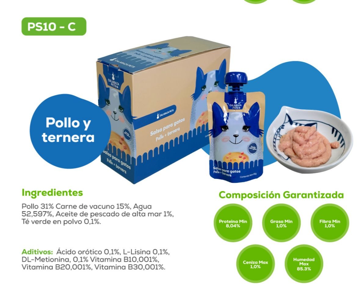 Una mezcla irresistible de pollo tierno y jugosa ternera, convertida en una salsa suave y apetitosa que transforma cada comida en una experiencia gourmet para tu gato. Perfecta para mezclar con alimento seco o húmedo, esta salsa no solo mejora el sabor, sino que también ayuda a mantener una buena hidratación. Formulada con proteínas animales de alta calidad, sin colorantes ni conservantes artificiales, es ideal para gatos de todas las edades y razas. Además, su textura ligera facilita la digestión y estimula el apetito, incluso en gatos exigentes o con bajo consumo de alimento.